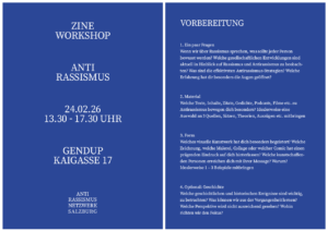 Zine-Workshop zum Thema Anti-Rassismus Kommentar verfassen / Von / Wann 24. Februar 2026 13:30 - 17:30 Zum Kalender hinzufügen ICS herunterladen Google Kalender iCalendar Office 365 Outlook Live Wo gendup - Zentrum f Frauen- u Geschlechterforschung Kaigasse 17, Salzburg, Salzburg, 5020 Veranstaltungstyp Workshop Salzburg Lade Karte ... Kaigasse 17 - Salzburg Veranstaltungen anzeigen 47.797593 13.049173 Spread the love